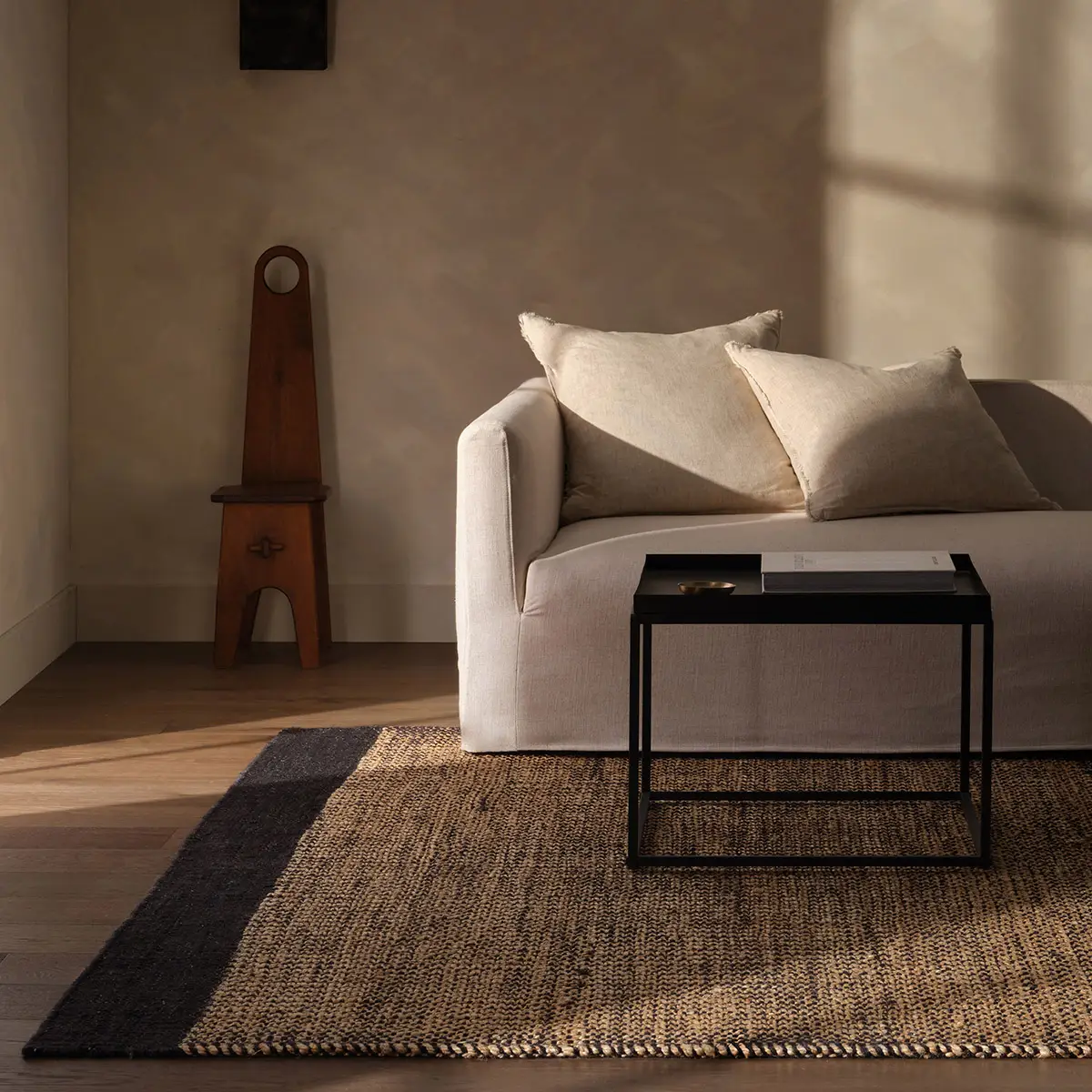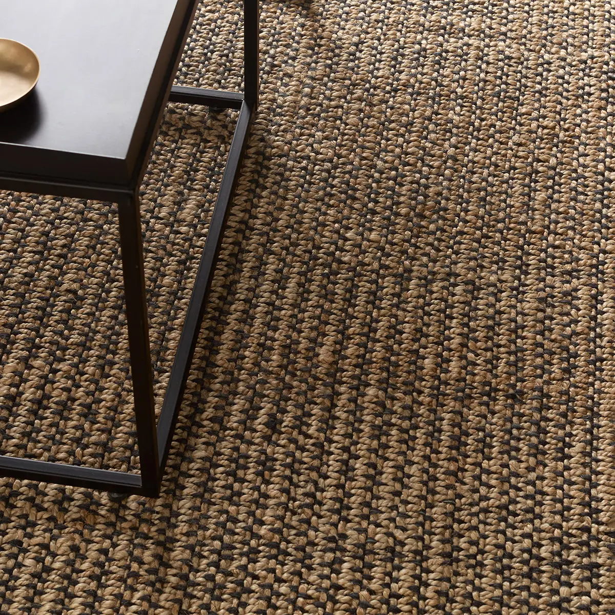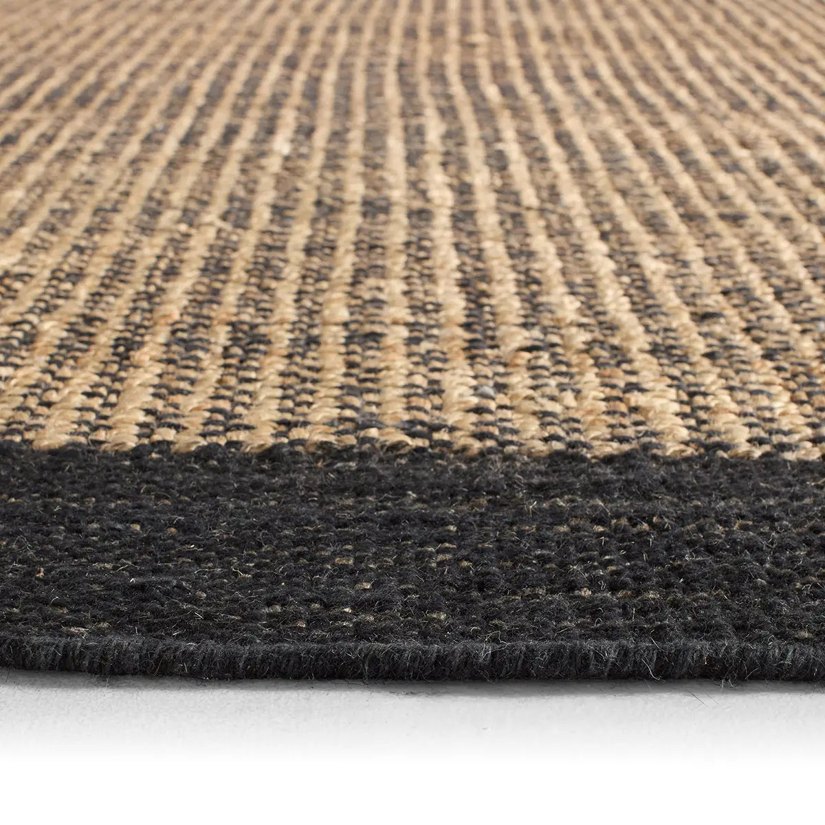 The design from the SOSDIR collection presents a striking visual statement, masterfully handcrafted by artisans. Its natural jute and wool pile blends deep black with warm tan hues in a sophisticated striped pattern, creating remarkable visual texture and depth.