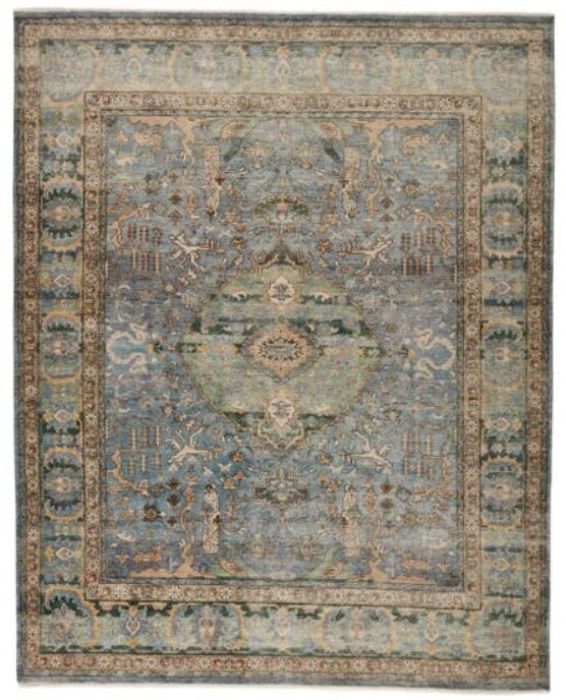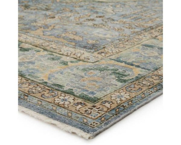 Whimsical colorways combine with the opulent detail of a traditional-inspired pattern–this collection represents nostalgia and progression, heritage and the contemporary. In serene tones of slate blue, green, golden tan, and deep brown, this inviting rug ground spaces with luxe appeal and an exceptional hand-knotted quality. Crafted of handspun Afghan wool, this artisan-made rug boasts an authentic, timeworn look.