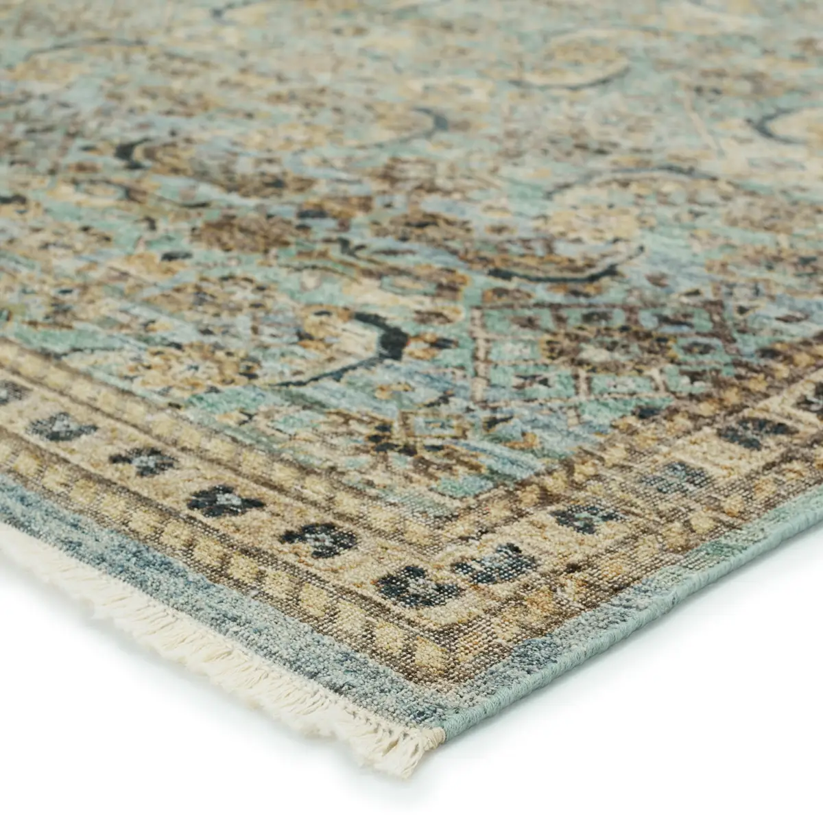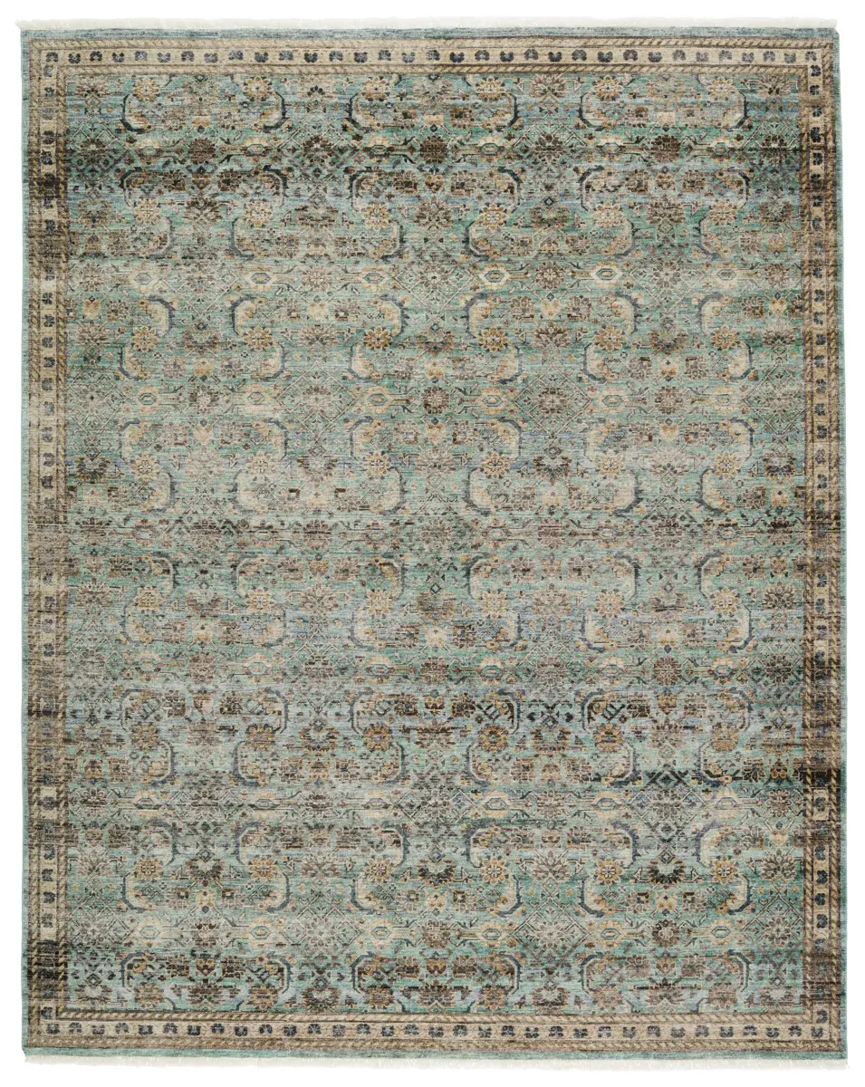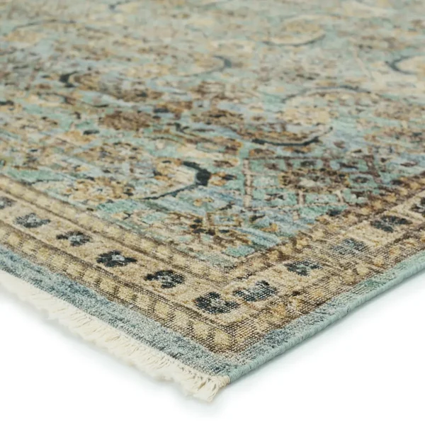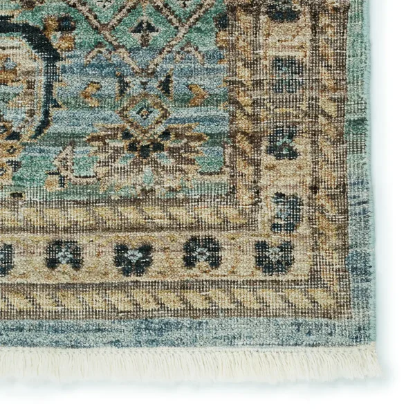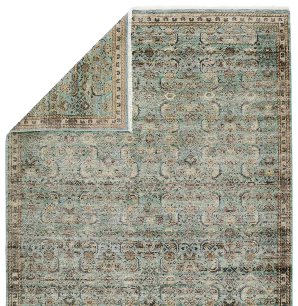 Whimsical colorways combine with the opulent detail of a traditional-inspired pattern–collection represents nostalgia and progression, heritage and the contemporary. The rug’s cool blue, green, golden tan, and black details ground spaces with luxe appeal and an exceptional hand-knotted quality. Crafted of handspun wool, this artisan-made rug boasts an authentic, timeworn look.