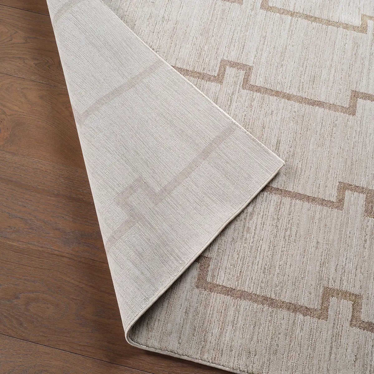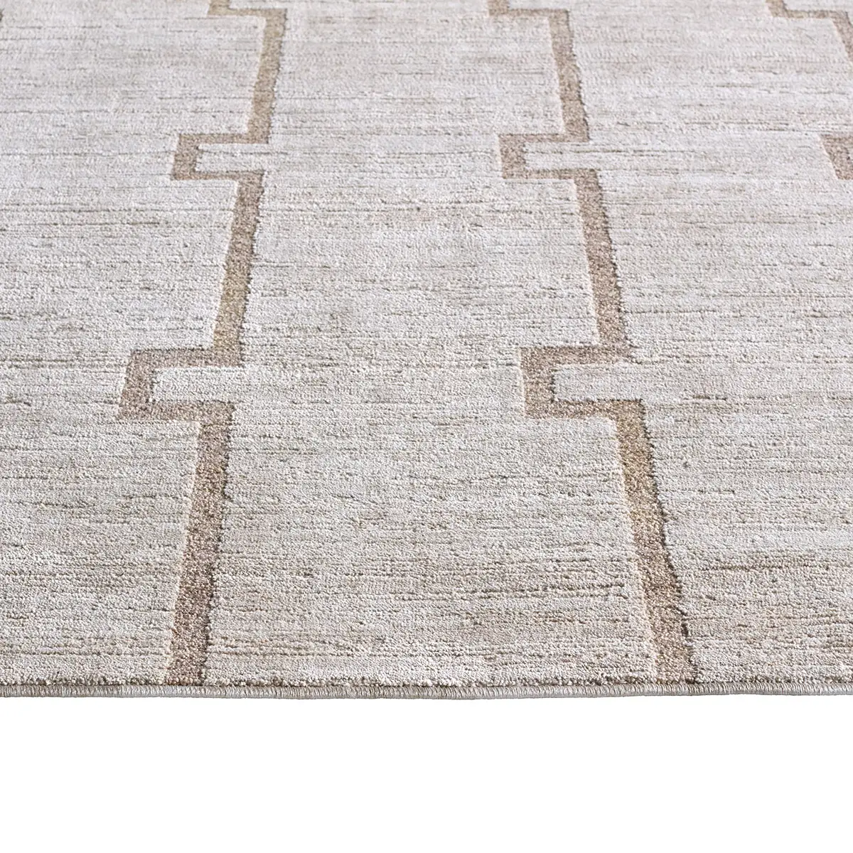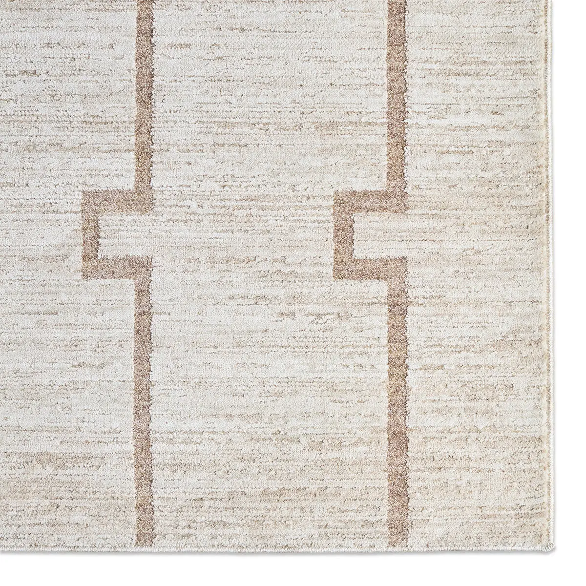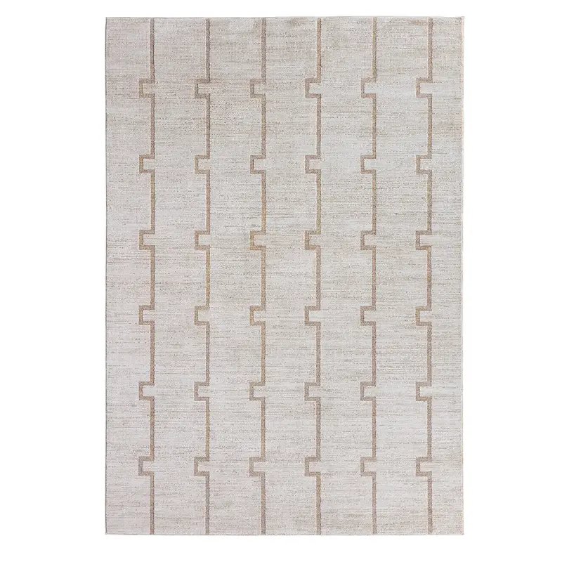 Clean, stepped lines create a modern rhythm in this design from the SREDIR collection. Ivory and warm tan form an interlocking trellis that feels both structured and serene. Its dimensional look is achieved through space-dyed yarns – adding subtle tonal variation – and cross-woven construction, which blends multiple hues for a more defined, high-resolution pattern. Power-loomed from 100% polyester, it is designed for everyday living, offering durability, fade resistance, and easy care. Its low-profile pile with carved high-low detailing adds texture, softness, and a gentle lustrous sheen that elevates the geometric design.