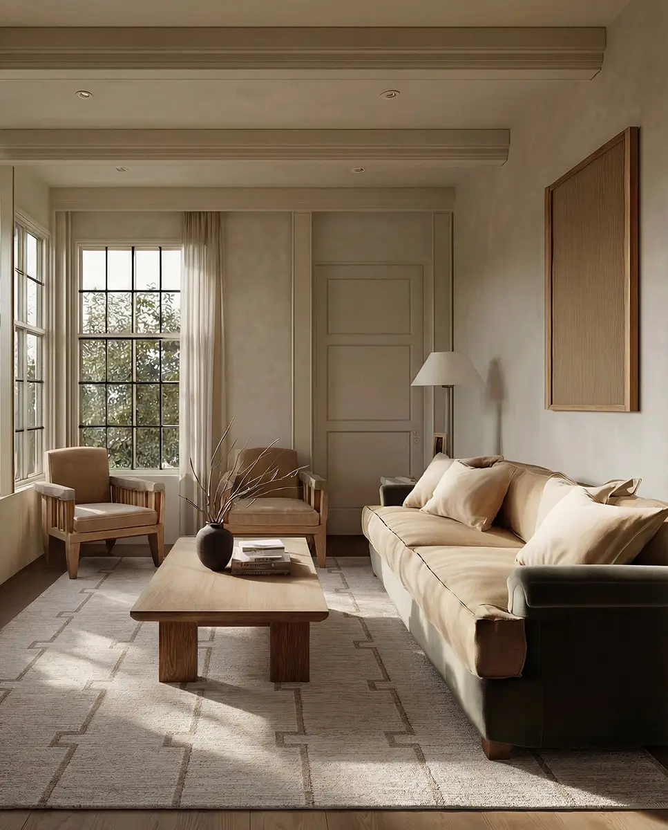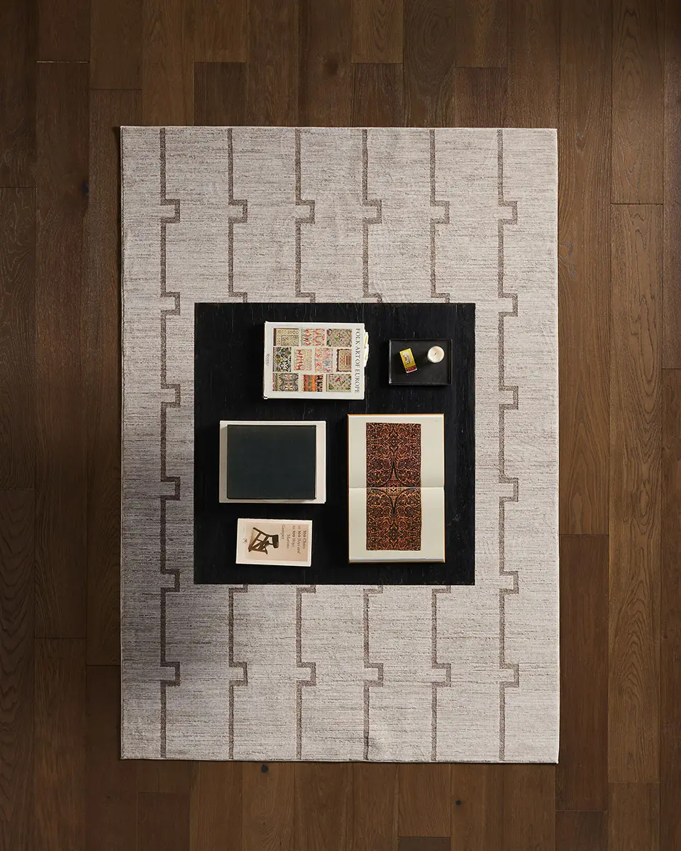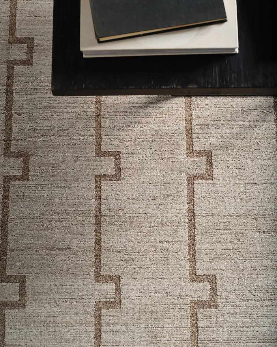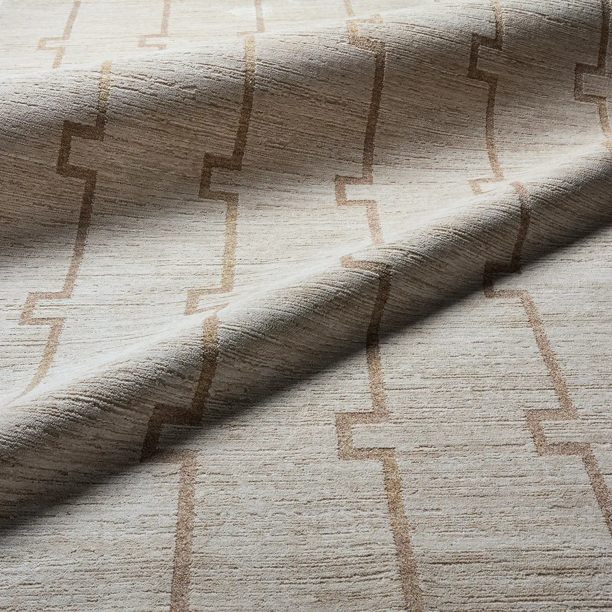 Clean, stepped lines create a modern rhythm in this design from the SREDIR collection. Ivory and warm tan form an interlocking trellis that feels both structured and serene. Its dimensional look is achieved through space-dyed yarns – adding subtle tonal variation – and cross-woven construction, which blends multiple hues for a more defined, high-resolution pattern. Power-loomed from 100% polyester, it is designed for everyday living, offering durability, fade resistance, and easy care. Its low-profile pile with carved high-low detailing adds texture, softness, and a gentle lustrous sheen that elevates the geometric design.