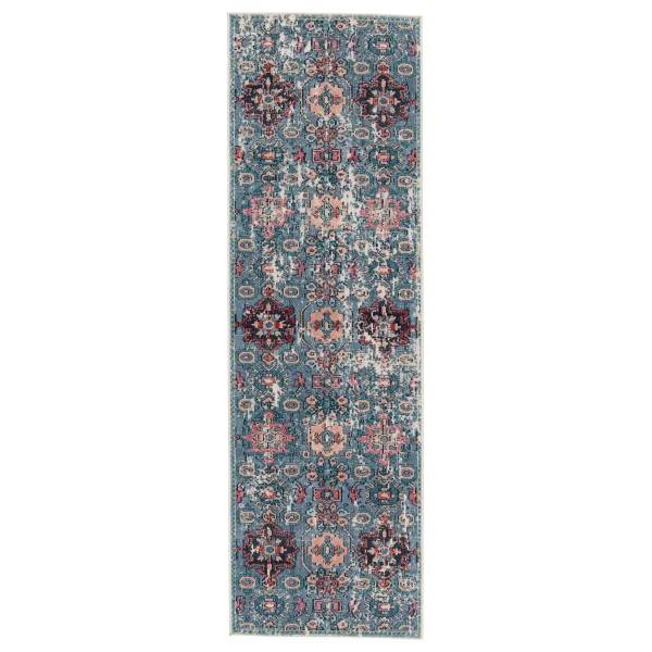 Bringing to life an enchanting and truly captivating style, the SWODIR collection boasts whimsical color combinations that are vibrant and inspired by traditional Turkish textiles that have been aged in the sun for a faded and timeless look. The design features grounding hues of blue, pink, and teal for a rich colorway. Crafted of textured and low-profile polyester, this performance-driven rug is perfect for homes with pets and kids or as a durable accent in outdoor seating areas.