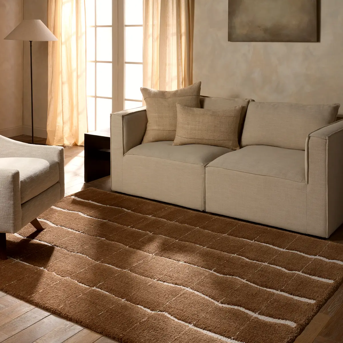 This indulgently soft rug is power loomed with a high-low pile, making it an ideal choice for areas with moderate foot traffic. Its captivating cracked earth design showcases slender, imperfect ivory lines against a rich brown backdrop, infusing warmth into any space it graces.