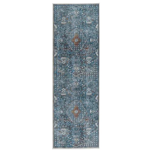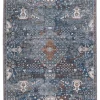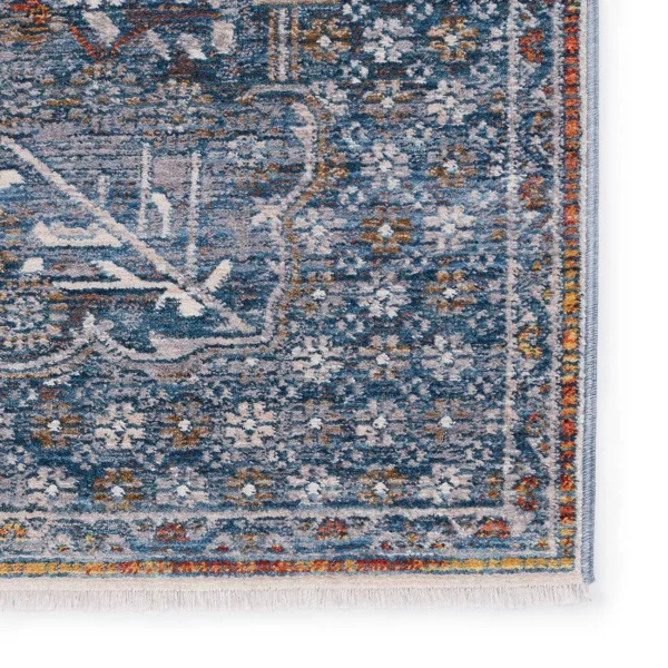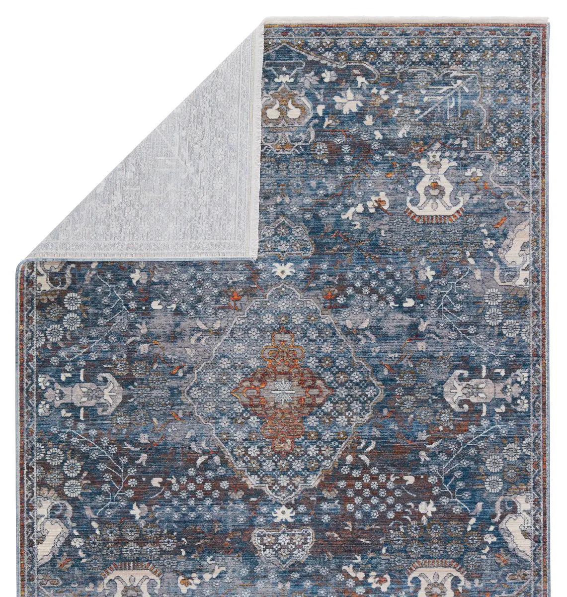 A complementary mix of vibrant and natural tones combine to create the effortlessly stylish TRRDIR collection. Space-dyed polyester lends a unique colorway and subtle, dimensional sheen to the stunningly detailed design. The eye-catching and detailed rug offers an ornate accent with an elegant medallion motif in rich hues of blue, yellow, orange, and gray.