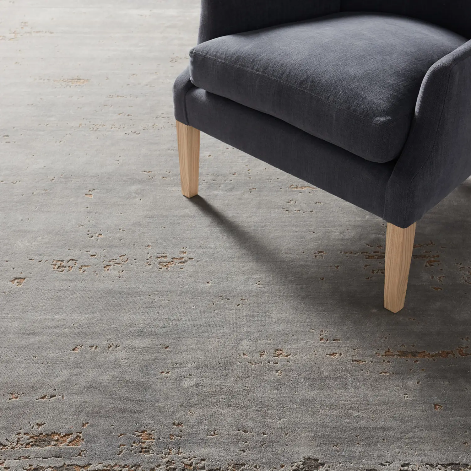 Inspired by the unrushed quality of the natural process, the UPKDIR collection features an assortment of grounding solid designs that are anything but basic. Rayon made from bamboo lends an inviting, silk-like texture and unique light-to-dark effect to the hand-knotted quality. The rug showcases a lustrous silver-gray color that is grounded by the naturally textured, charcoal and bronze wool fibers, creating a distinct shine and matte combination.
