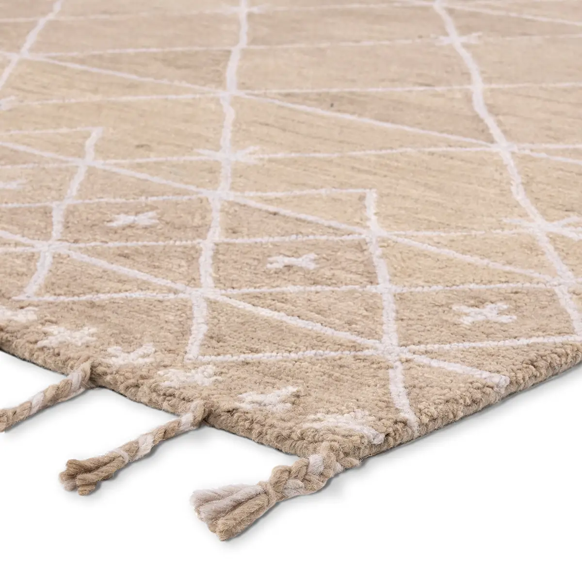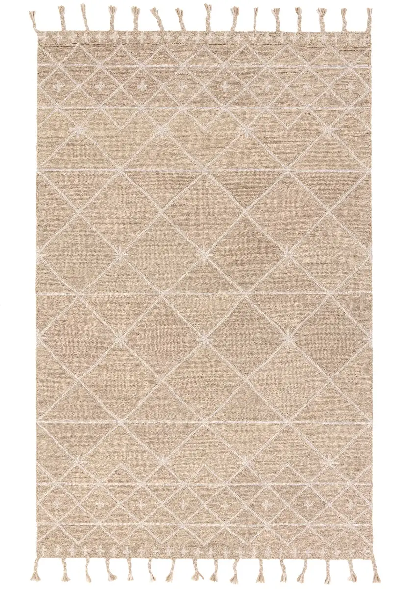 Hand tufted of wool, the collection infuses contemporary spaces with inspiring patterns and versatile colorways. The glam-meets-global rug features an ivory Moroccan-inspired trellis design that covers the tan backdrop with a space-dyed effect. This rug adds a boho-chic charm to any high or low traffic space of the home.